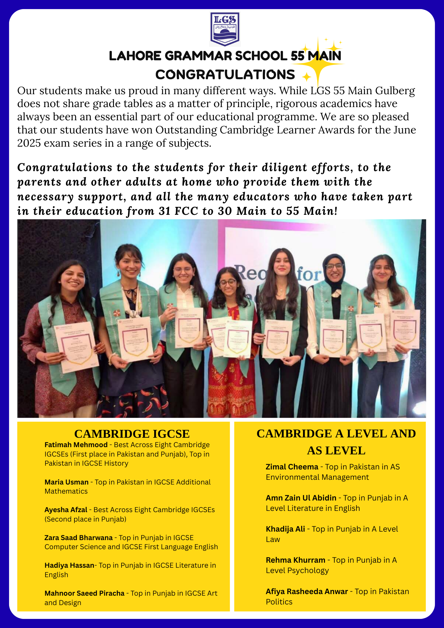 Today, Lahore Grammar School provides education to girls till A Level. It has extended its network to cater to the needs of the middle income group in its Landmark Schools. LGS has branches in Islamabad, Karachi, Peshawar, Quetta, Multan, Gujranwala, Sialkot, Faisalabad and Gujrat. It offers quality education to the low-income group through the Lahore Education Society School, entirely supported and funded by LGS. However, please note that this website caters only to schools under the stewardship of Director and Principal, Mrs. Nasrene Shah- namely LGS 31 FCC, LGS 30 Main and LGS 55 Main.